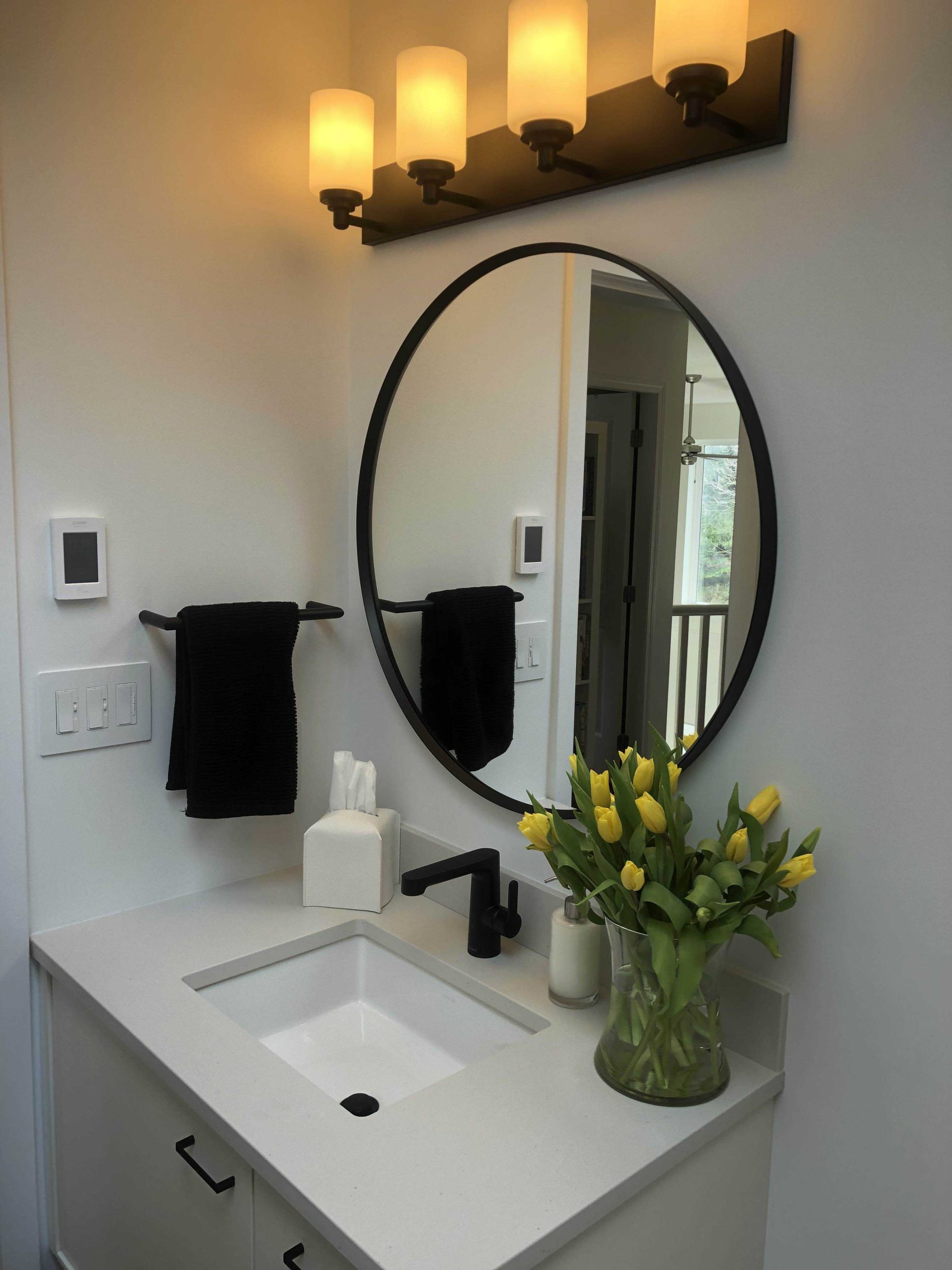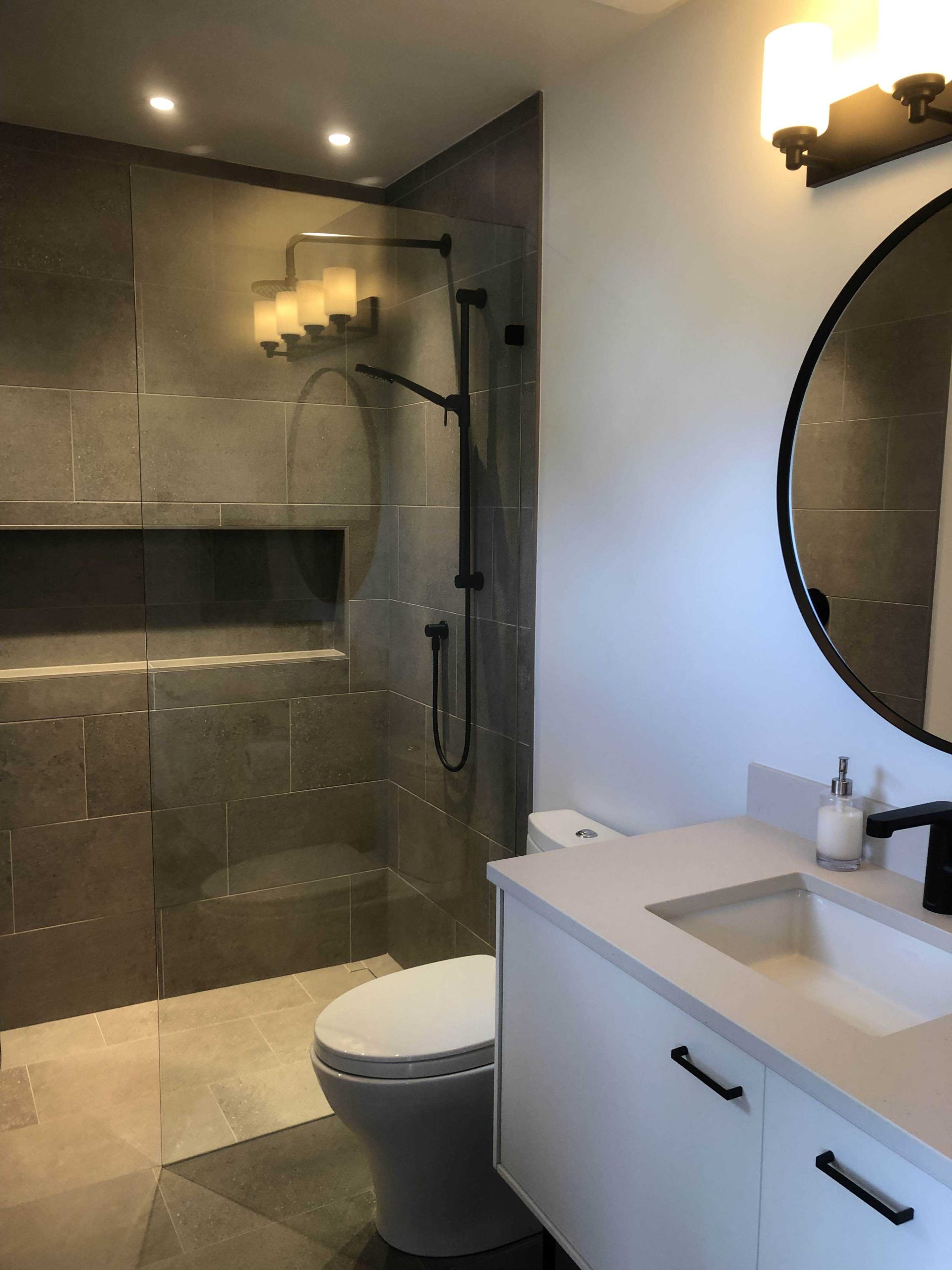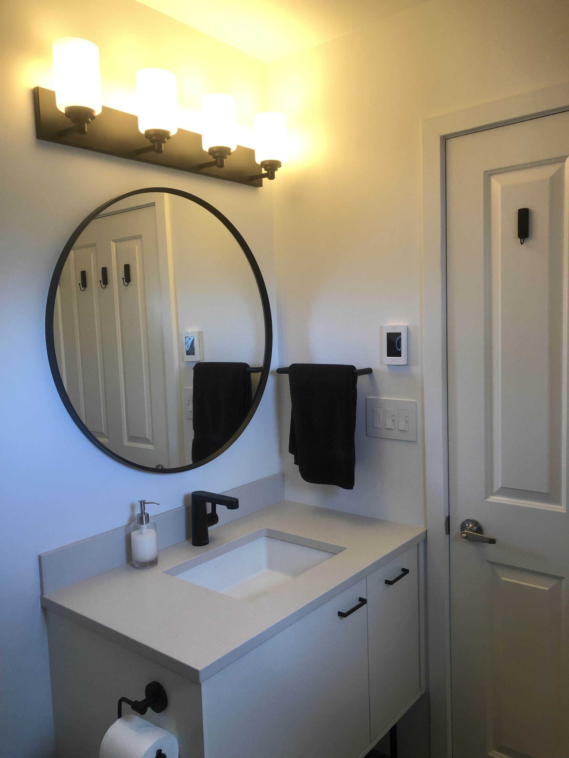 Finishing touches picked up on the black-and-white theme, to match the rest of the house in creative ways. The owners enthusiastically collaborated on choices for lighting, hardware, towel racks, and other points of fine-tuning. Having achieved strong outcomes on the original scope, that expanded to include a new roof and full exterior paint job as project add ons.