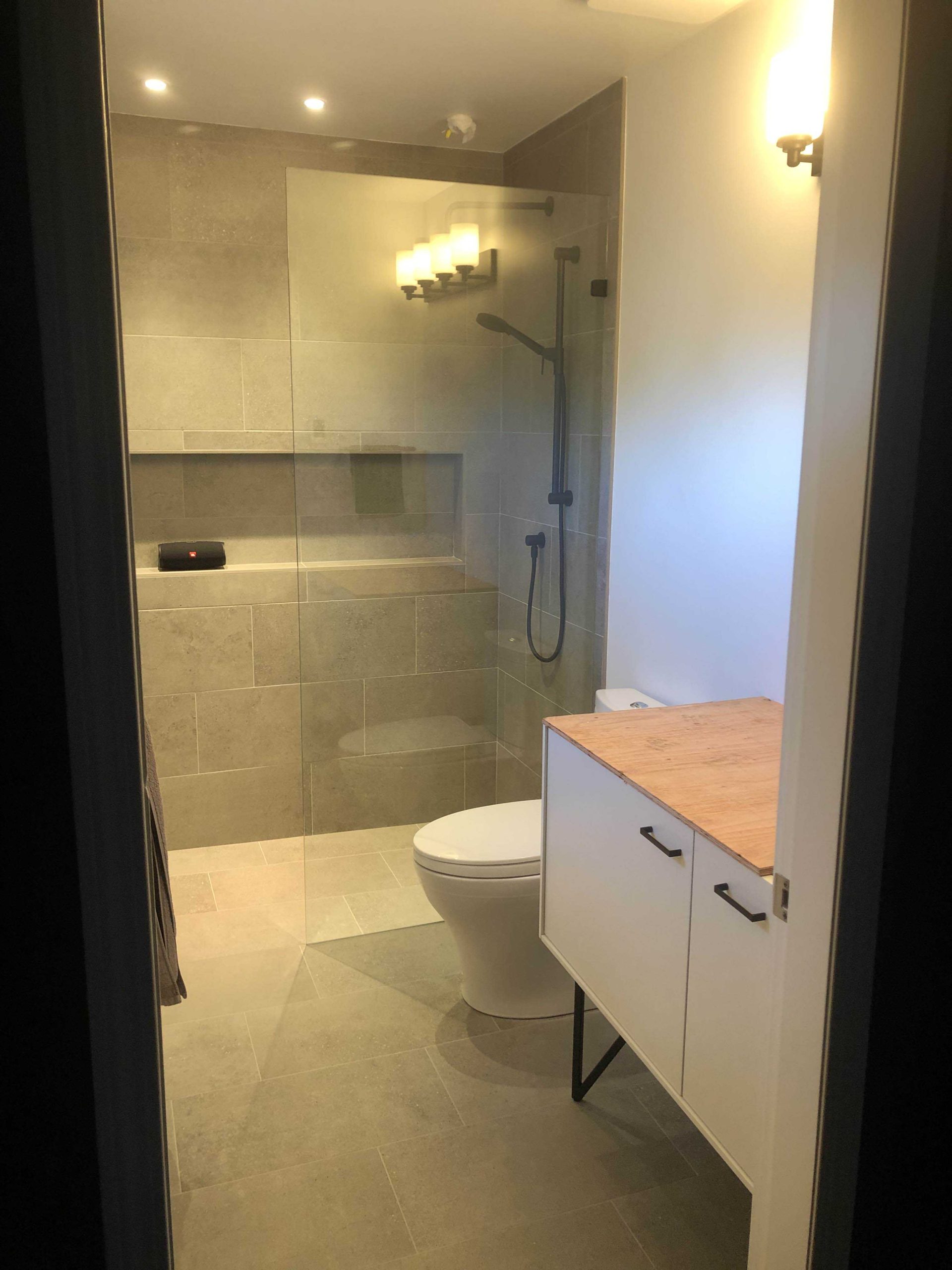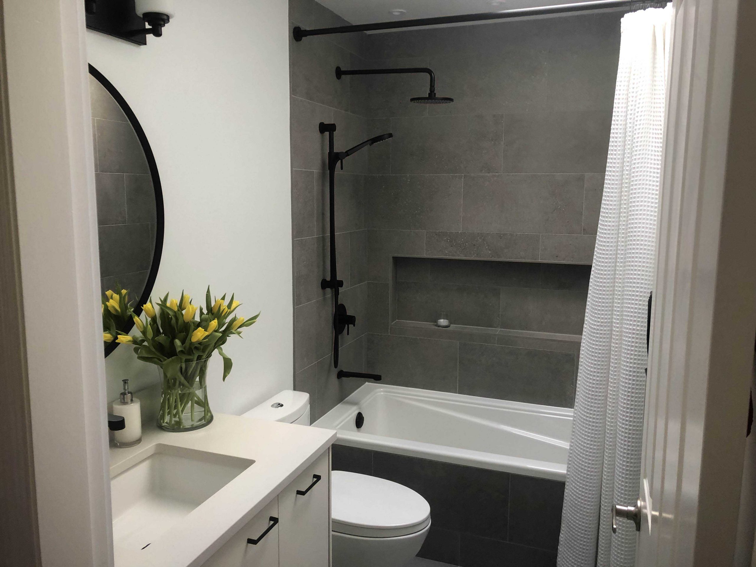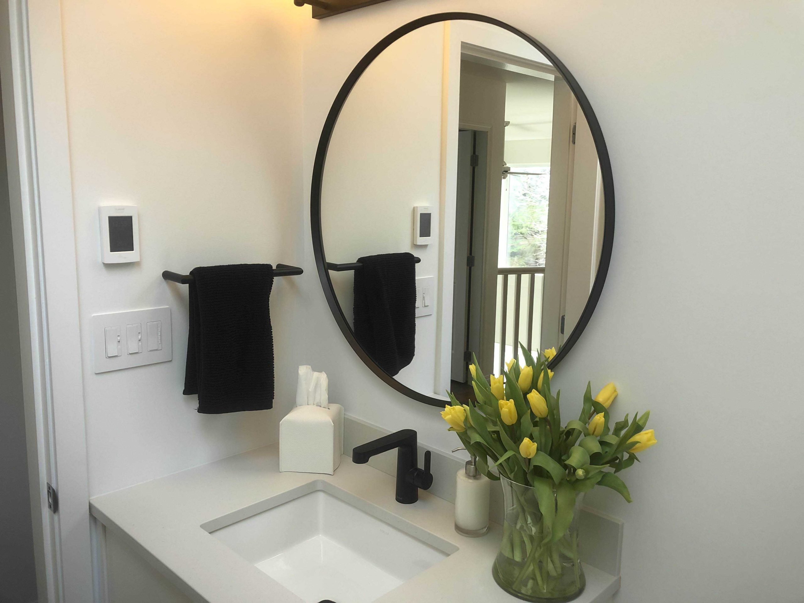 Finishing touches picked up on the black-and-white theme, to match the rest of the house in creative ways. The owners enthusiastically collaborated on choices for lighting, hardware, towel racks, and other points of fine-tuning. Having achieved strong outcomes on the original scope, that expanded to include a new roof and full exterior paint job as project add ons.