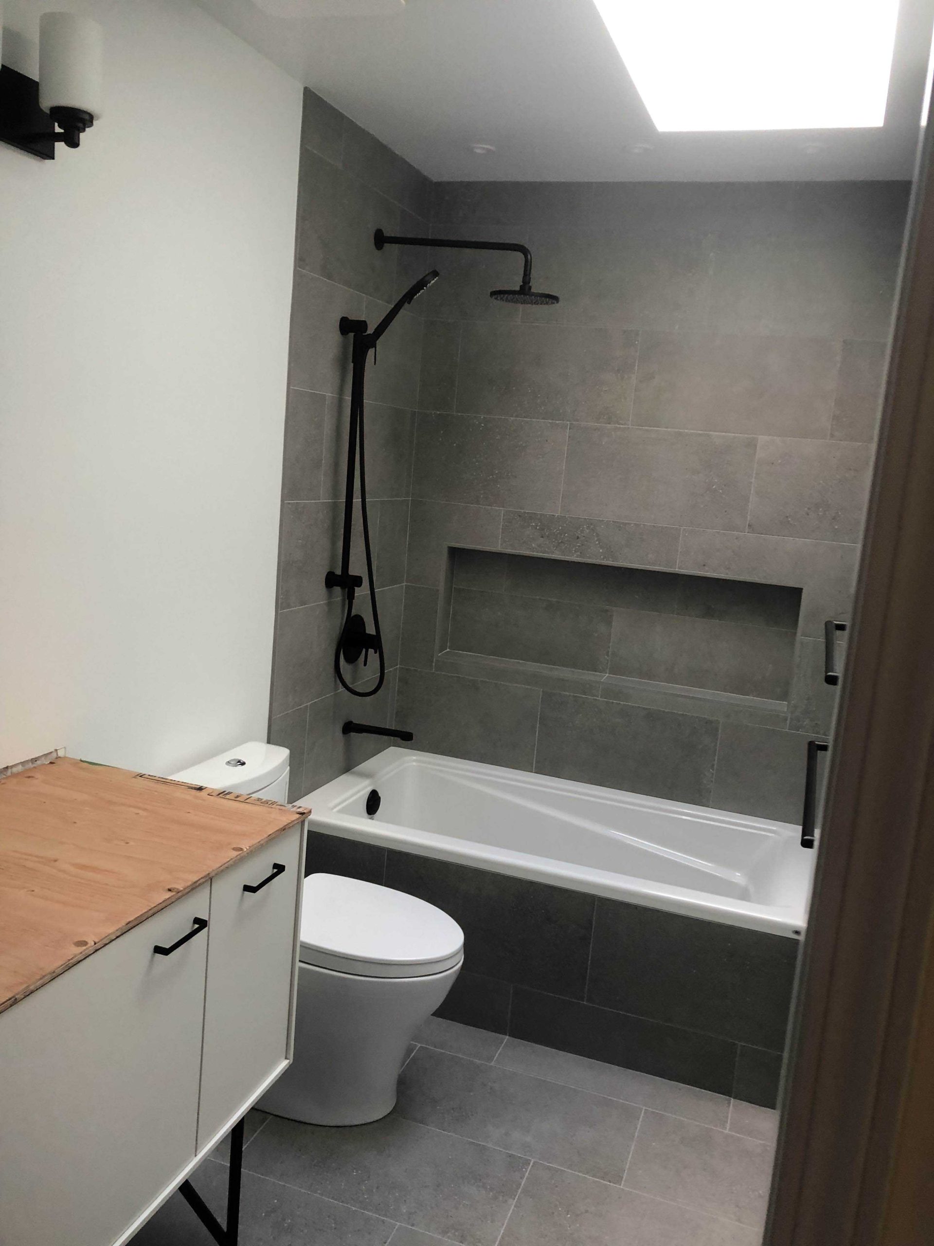 Both bathrooms received a total overhaul, beginning with ripping everything down to the studs. We installed heated floors; insulation for soundproofing between rooms; new task lighting; as well as beautiful tiling and custom niches. A one-of-a-kind shower-and-bathtub combo stands next to custom cabinetry and stylish counters.